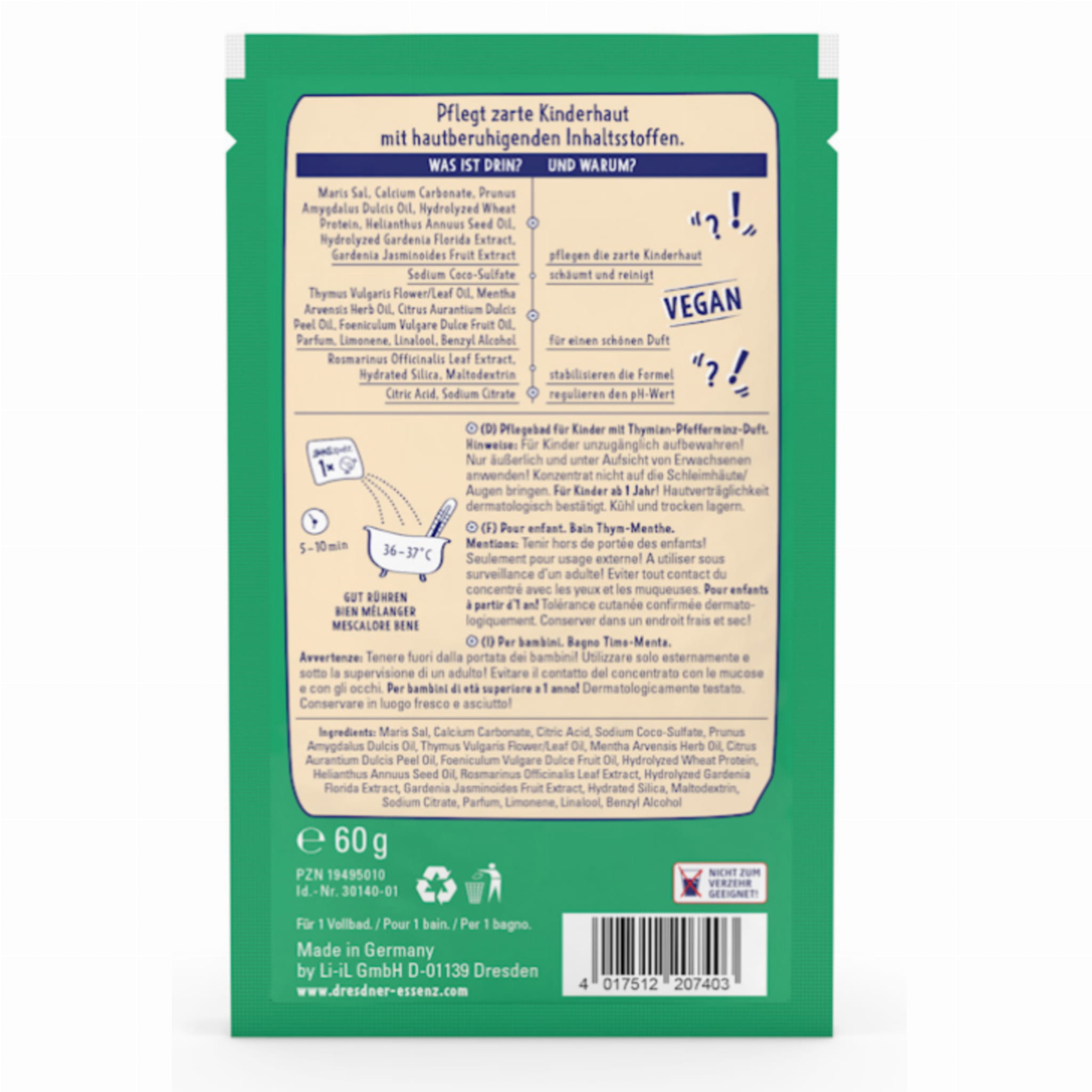 DreckSpatz „Bądź Zdrów” to delikatna, aromatyczno-ziołowa sól do kąpieli stworzona specjalnie dla dzieci od 1. roku życia. Wzbogacona o naturalne minerały, olejki eteryczne oraz ekstrakty roślinne, wspiera pielęgnację wrażliwej skóry i ułatwia oddychanie dzięki właściwościom tymianku i mięty. To idealna, kojąca kąpiel w czasie infekcji i chłodniejszych dni.