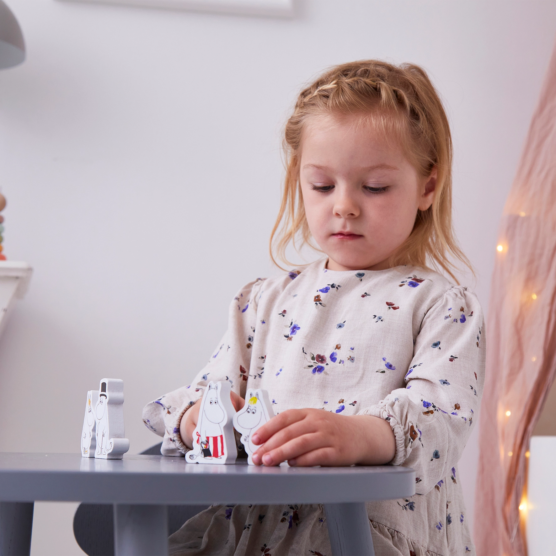 Zabierz dziecko do magicznego świata Muminków dzięki uroczemu zestawowi drewnianych figurek przedstawiających bohaterów uwielbianej bajki. W komplecie znajduje się pięć kultowych postaci: Muminek, Mama Muminka, Tata Muminka, Mała Mi oraz Panna Migotka. Figurki idealnie pasują do zabawy w domku Muminków i pozwalają dzieciom tworzyć własne historie inspirowane bajkowym uniwersum.