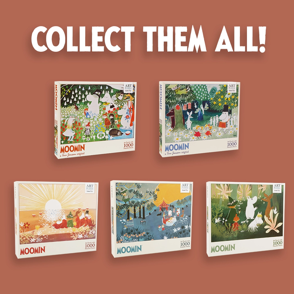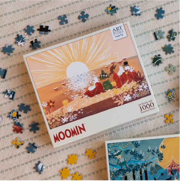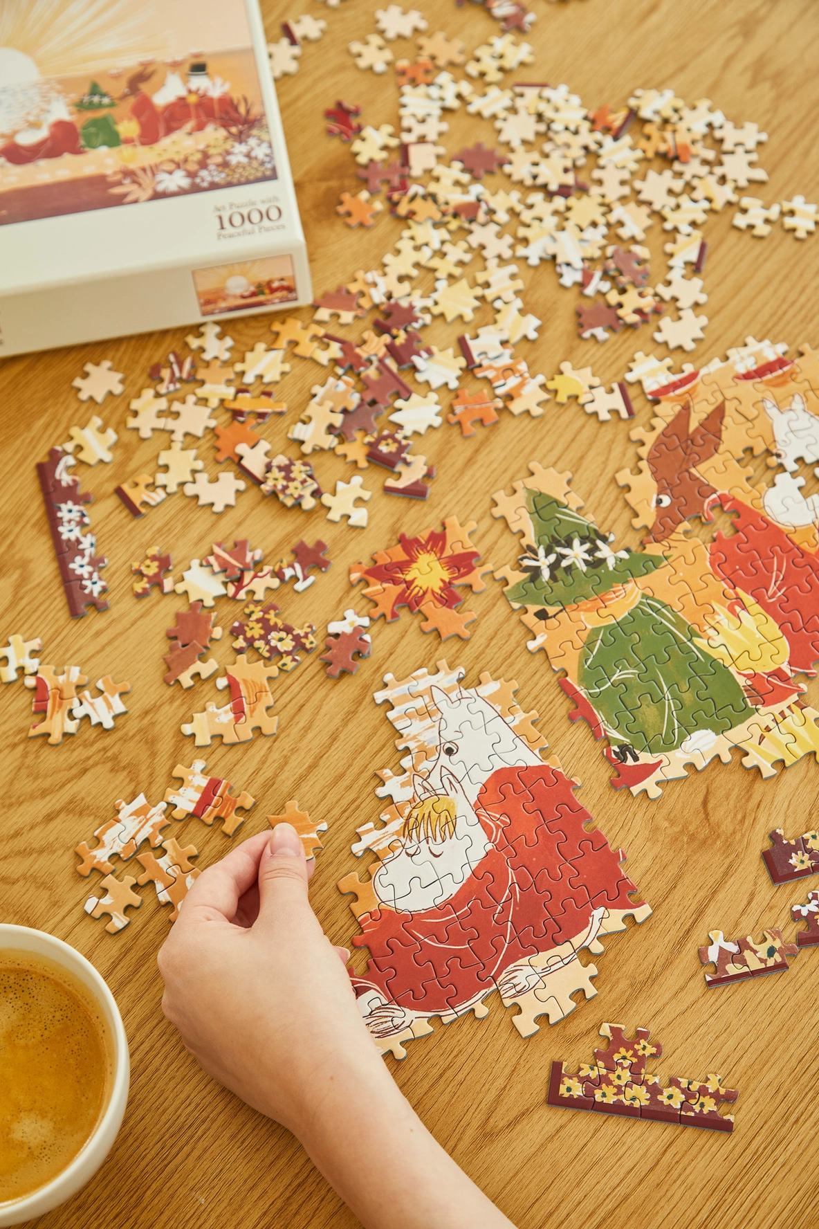 Moomin Art Puzzle Red to artystyczne puzzle z ilustracją przedstawiającą Muminka oraz jego przyjaciół z Doliny Muminków, wspólnie bawiących się w ciepłym świetle zachodzącego słońca. Intensywna, czerwona kolorystyka nadaje ilustracji wyrazisty charakter i przyciąga uwagę bogactwem detali.