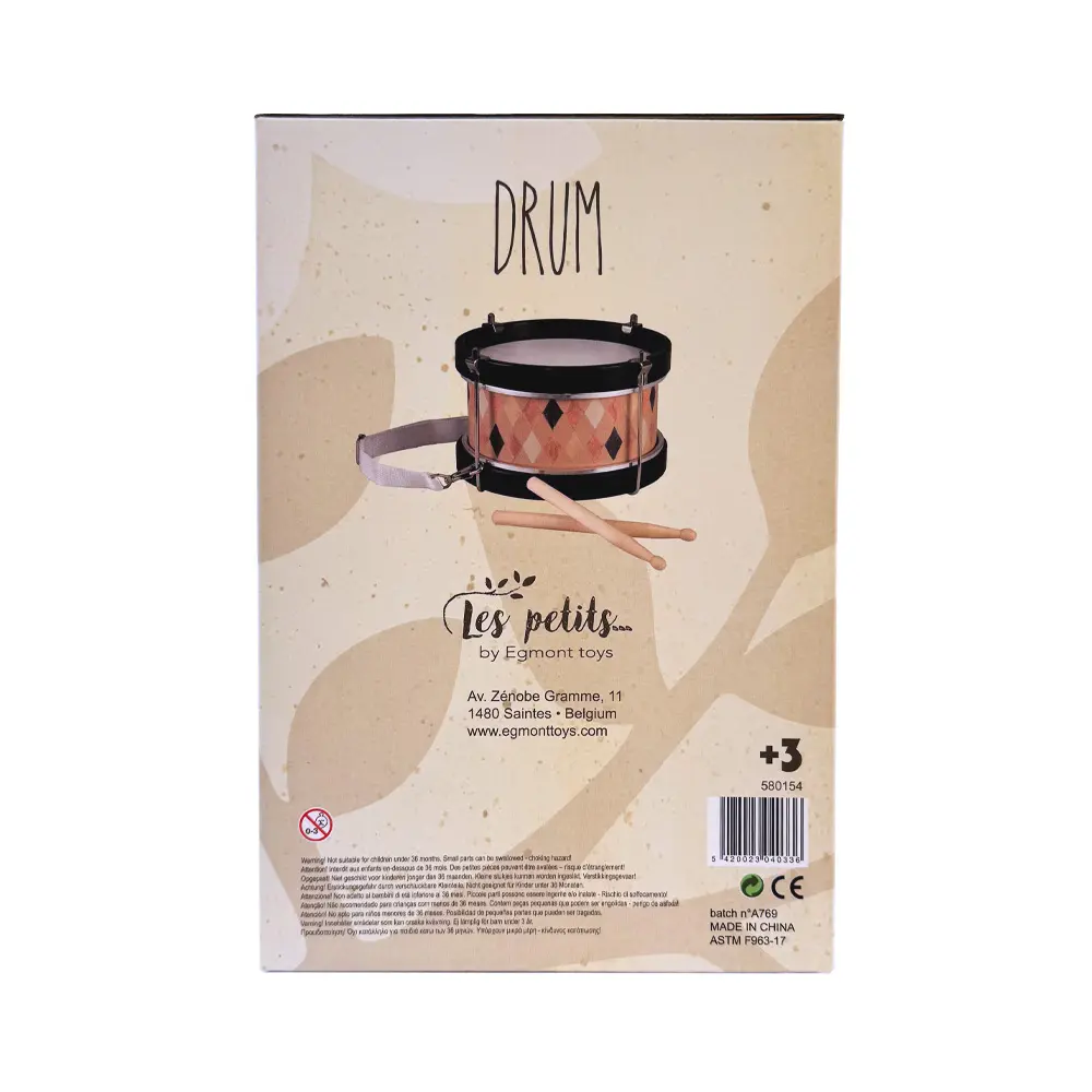 Ciepła paleta kolorów Terra oraz wzór w stylu harlekina przyciągają wzrok, czyniąc bębenek zarówno zabawką, jak i dekoracją dziecięcego pokoju. Instrument można trzymać na szyi dzięki regulowanemu paskowi lub postawić na płaskiej powierzchni. W zestawie znajdują się dwie drewniane pałeczki.