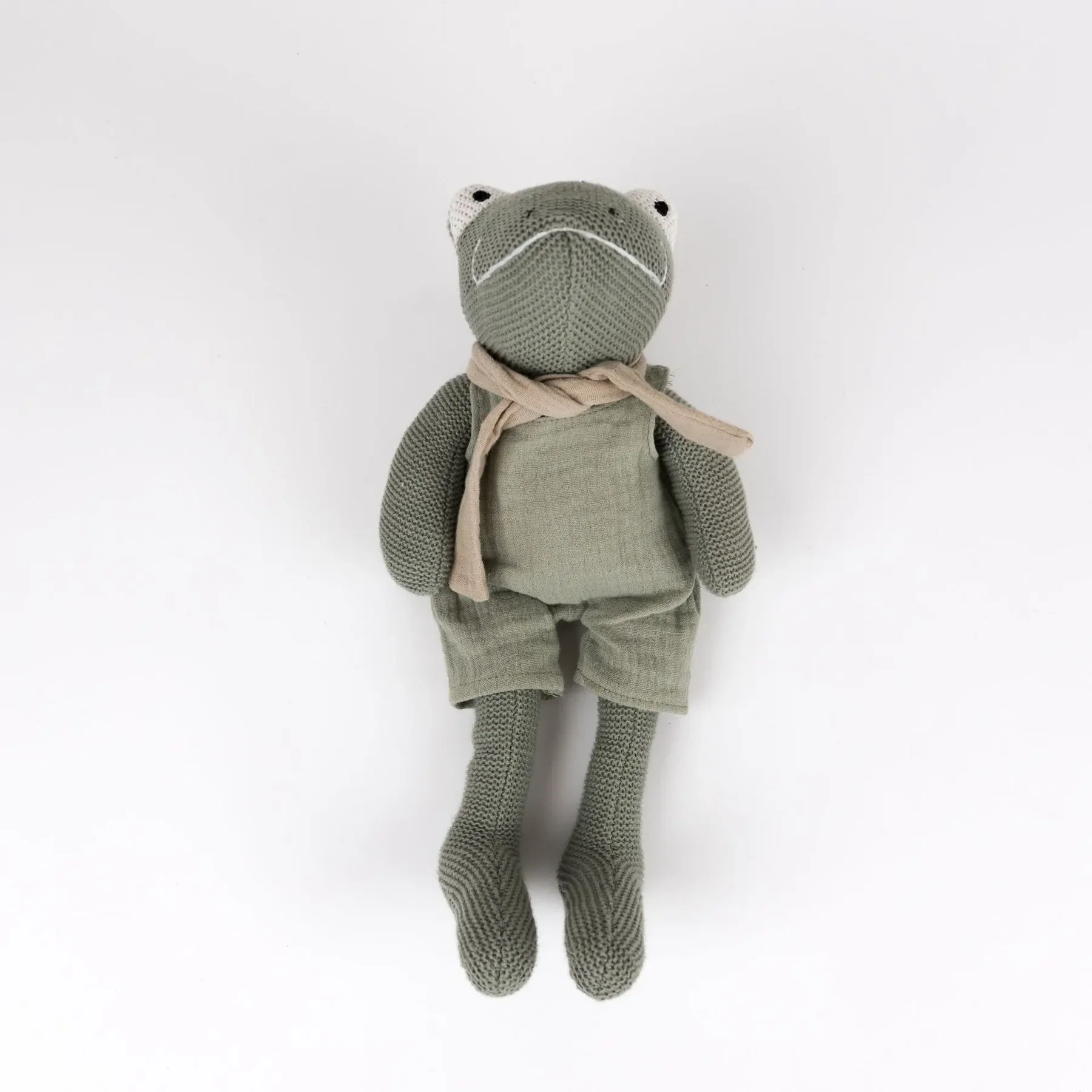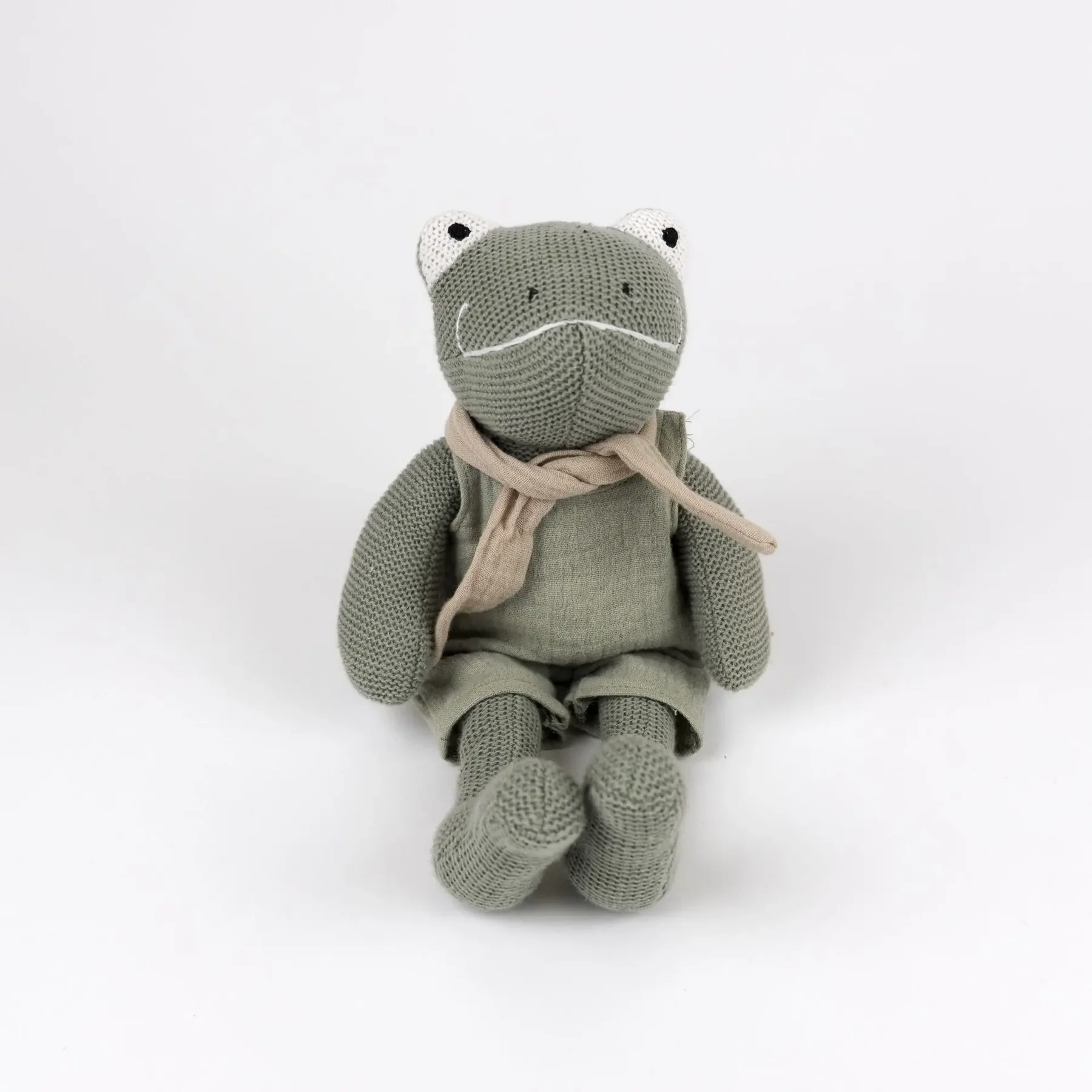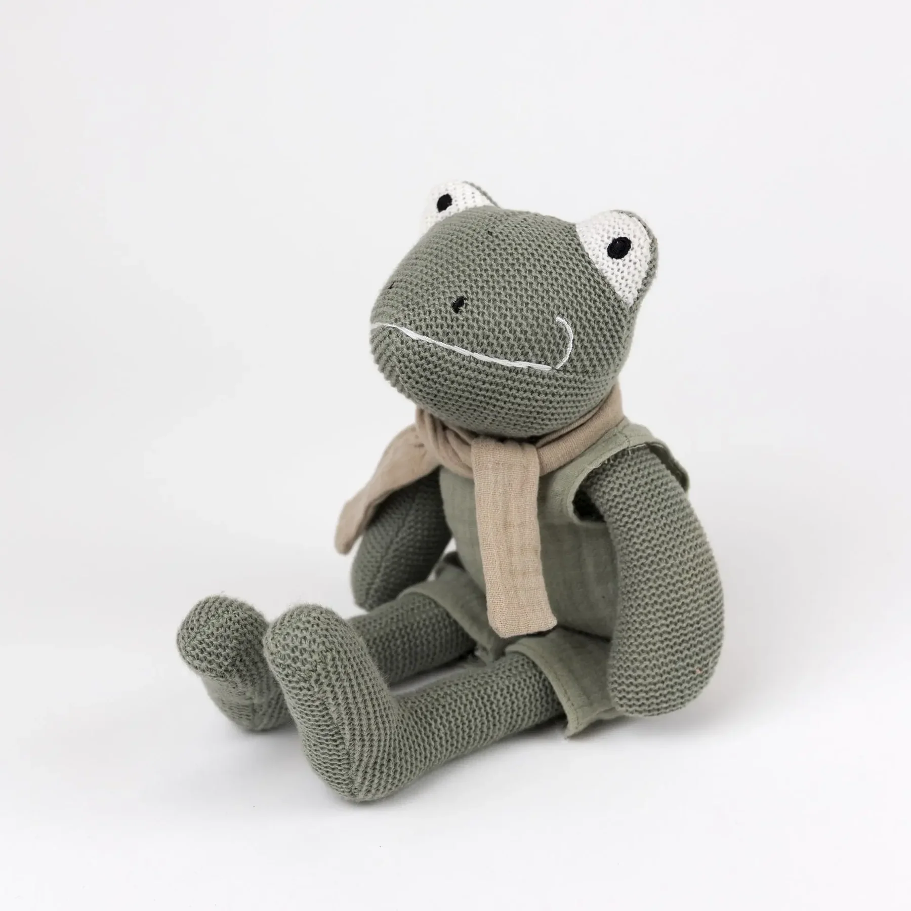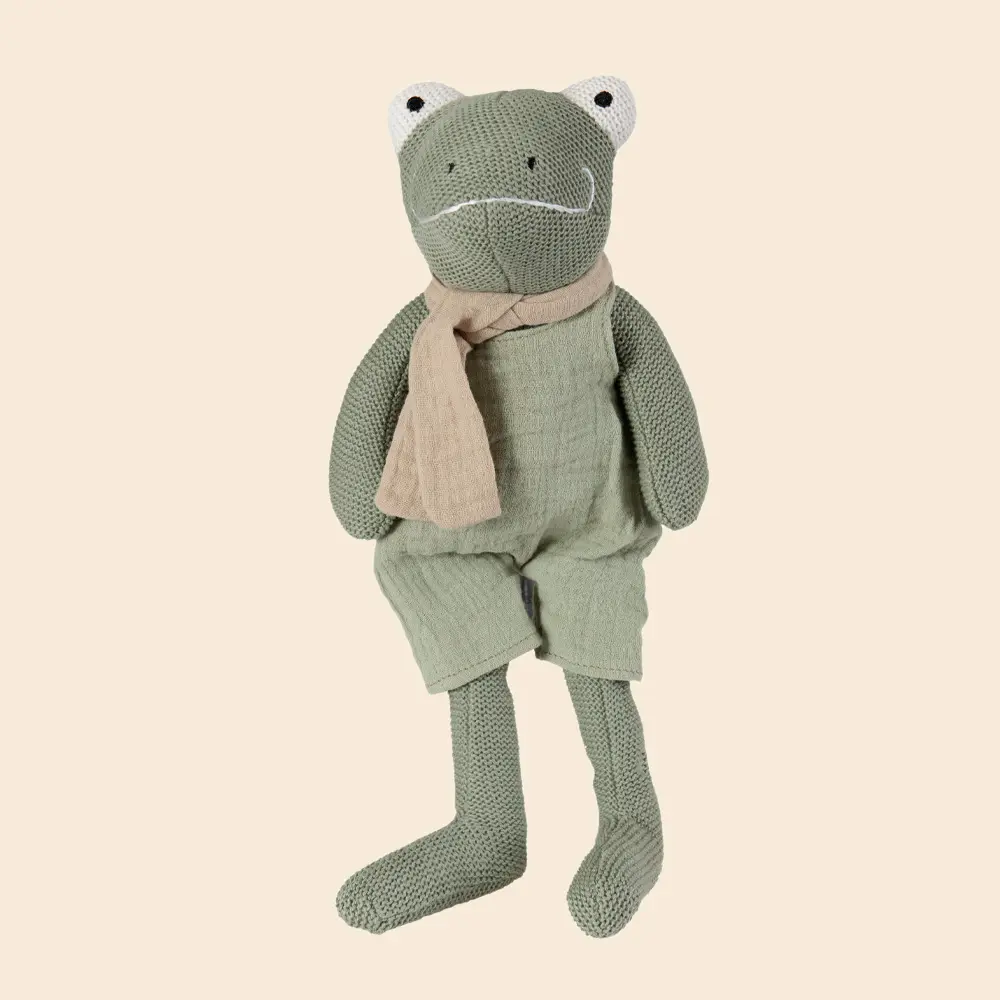 Żabka Jeremy to wyjątkowo miękka dzianinowa przytulanka z delikatną grzechotką ukrytą w środku. Długie rączki i nóżki sprawiają, że Jeremy idealnie nadaje się do przytulania i towarzyszenia dziecku w codziennych przygodach.