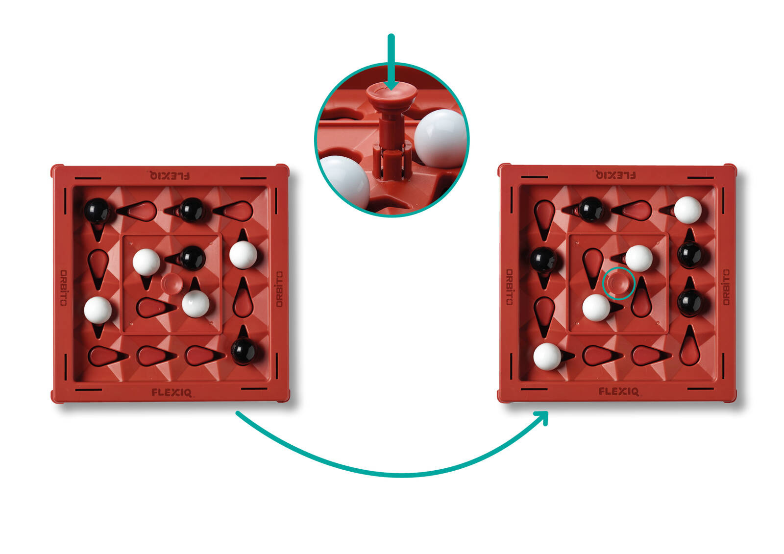 Celem gry jest ułożenie czterech kulek w swoim kolorze – poziomo, pionowo lub po skosie. Brzmi prosto? Do czasu! Na środku planszy znajduje się opatentowany przycisk Orbito, który po naciśnięciu przesuwa wszystkie kulki o jedno pole po ich „orbitach”. Każda tura może więc nieoczekiwanie zmienić układ gry, co sprawia, że rozgrywka jest dynamiczna, nieprzewidywalna i niesamowicie wciągająca.