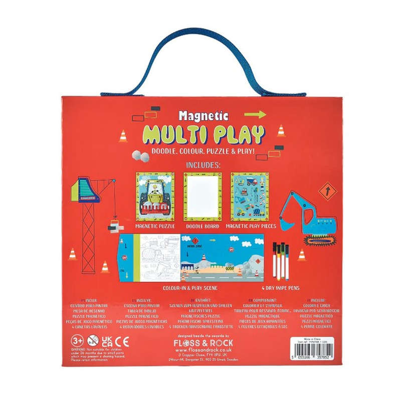 Układaj puzzle, rysuj, koloruj i baw się!Zestaw Magnetyczny Na Budowie to cztery lubiane i popularne zabawy w jednym pudełku, które gwarantują dzieciom świetną i kreatywną zabawę na wiele godzin. Po rozłożeniu zestawu odsłania się atrakcyjną układankę składającą się z 20 magnetycznych elementów, 4 kolorowe pisaki z gumkami do wycierania na sucho oraz plansze do rysowania i pisania. Zestaw zawiera także magnetyczne koparki, betoniarki, wywrotki i młodych budowniczych, co umożliwia niekończącą się zabawę na planszy magnetycznej. Pudełko składa się na płasko i jest wyposażone w poręczny uchwyt do przenoszenia, dzięki czemu idealnie sprawdza się w podróży oraz do zabawy na świeżym powietrzu.
