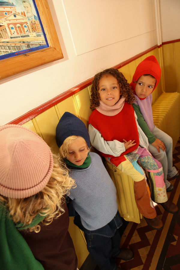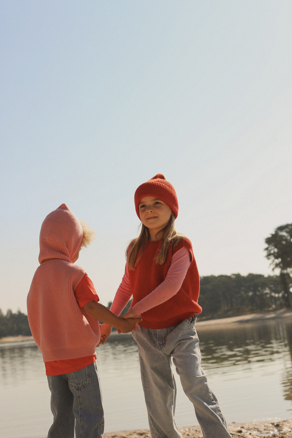 Ta bezszwowa kamizelka jest dziana z jednego kawałka, dzięki czemu jest bardzo wygodna dla dzieci. Subtelna elastyczna nić w kołnierzu pozwala na rozciągnięcie szyi podczas zakładania, a następnie idealnie przylega. Ściągacz typu fisherman’s rib sprawia, że jest to najdelikatniejsza kamizelka. Łatwo ją połączyć z koszulą lub bluzką, aby stworzyć radosny strój.