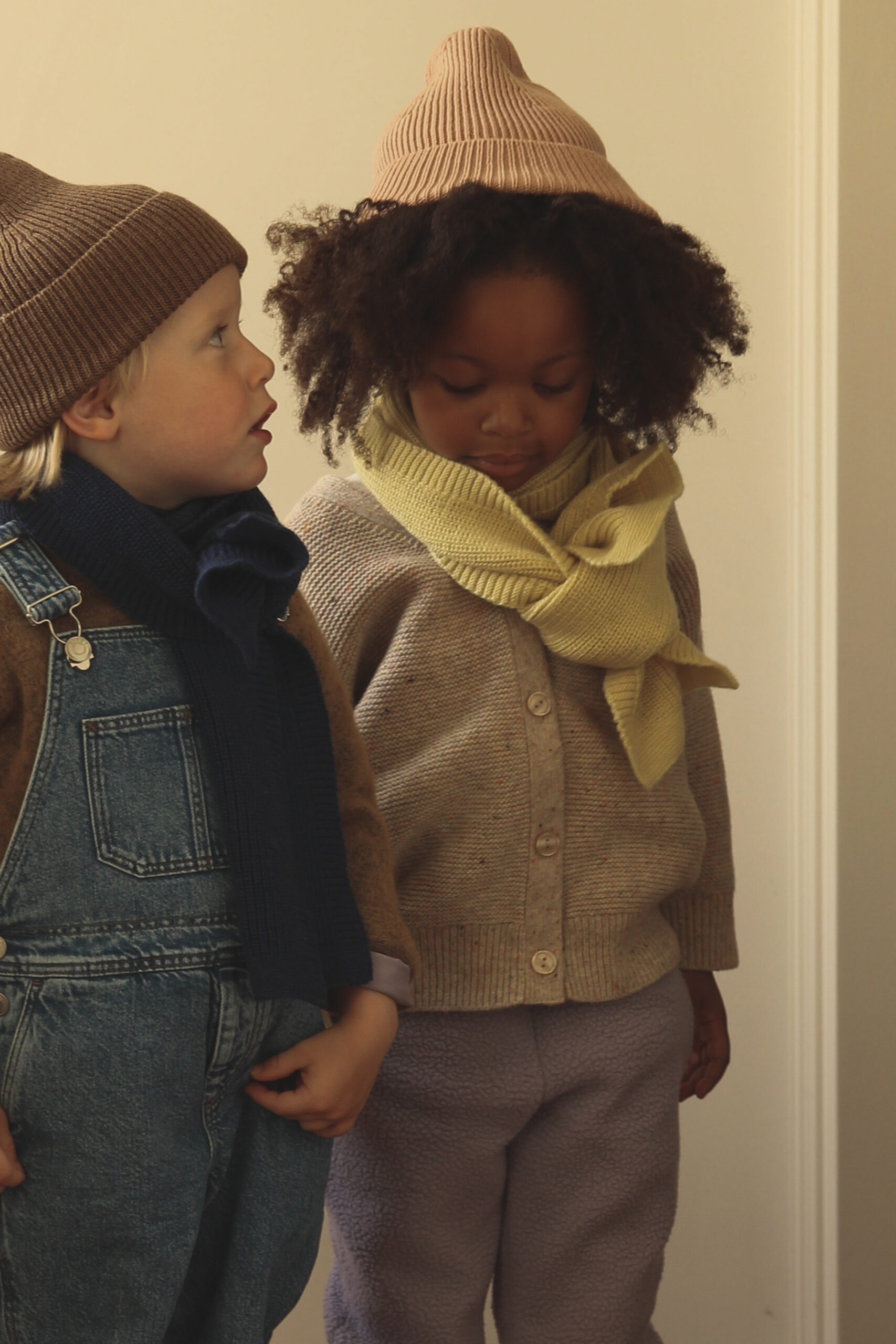 Przytulny szalik z prążkowanym splotem dla dzieci, z wykończeniem brzegów ściegiem francuskim. Ten uroczy zimowy dodatek jest idealny, aby zapewnić maluchom ciepło i wygodę.