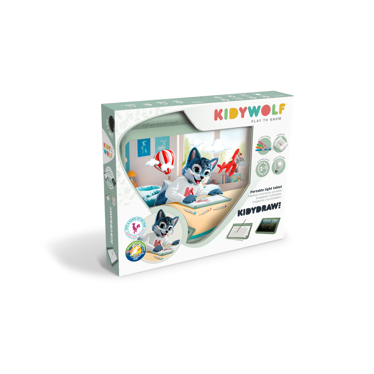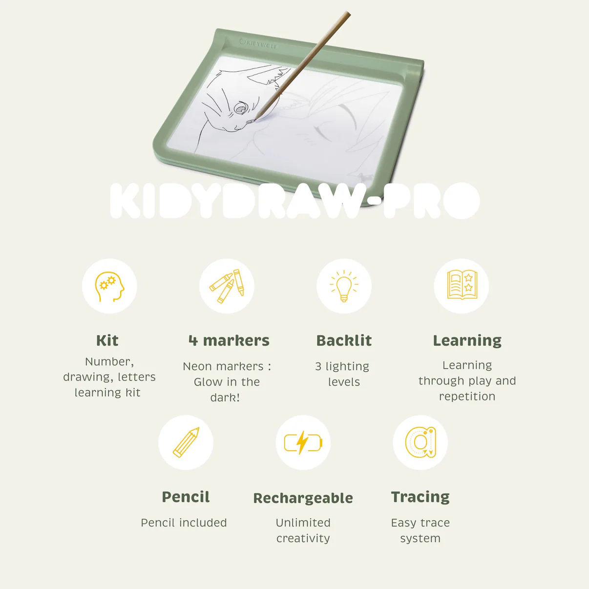Kidywolf KIDYDRAW PRO green to nowoczesny tablet rysunkowy dla dzieci, który łączy naukę, zabawę i rozwój kreatywności w jednym urządzeniu. Dzięki podświetlanej powierzchni LED dziecko może łatwo odwzorowywać rysunki, litery i cyfry, rozwijając zdolności manualne oraz naukę pisania.