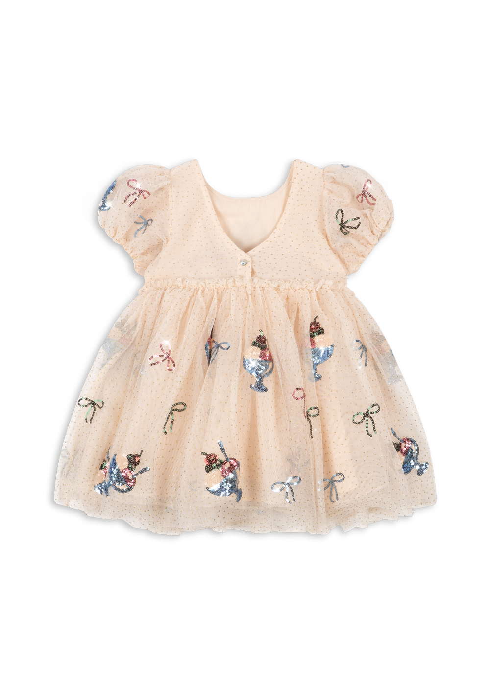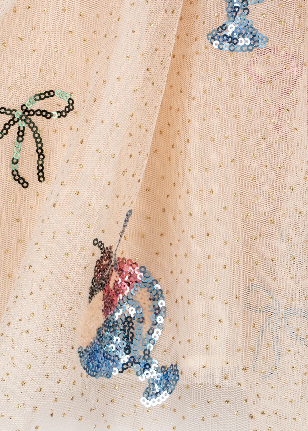 Sukienka ze zjawiskową objętością z tiulu z krótkimi bufiastymi rękawami. Sukienka ma zwiewny krój, a jej spódnica faluje i kołysze się podczas zabawy i tańca. Jest ozdobiona haftem z cekinów, który stanowi idealne wykończenie. Podszewka z miękkiej bawełny zapewnia wygodę noszenia. Oczaruje, nada delikatności i elegancji każdej Małej Miłośniczce Mody!