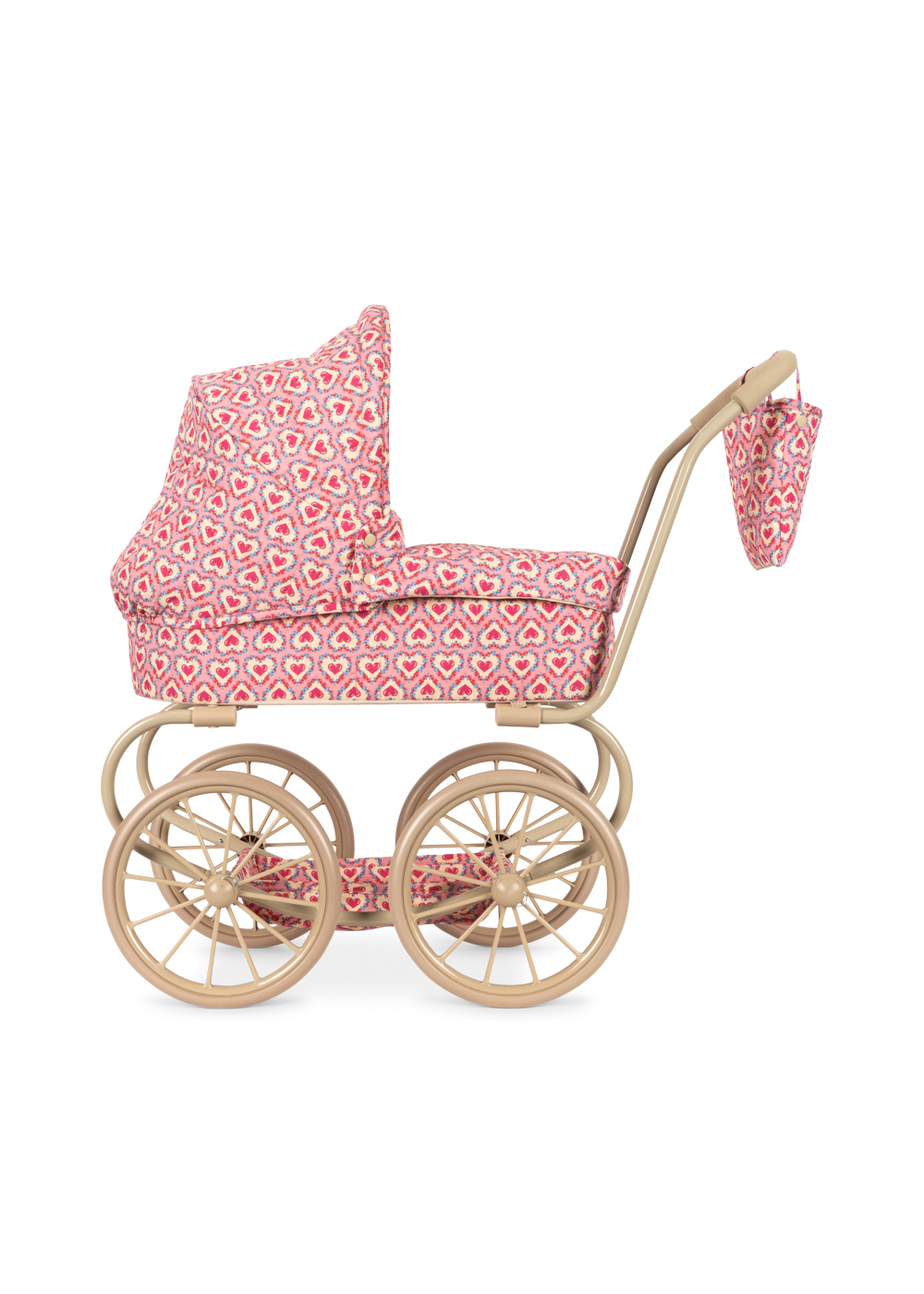 Wózek dla lalek w stylu vintage z czterema dużymi kołami, które sprawiają, że jest łatwy i stabilny w prowadzeniu dla młodszych dzieci. Zaprojektowany z pikowanego materiału z delikatnymi krawędziami.