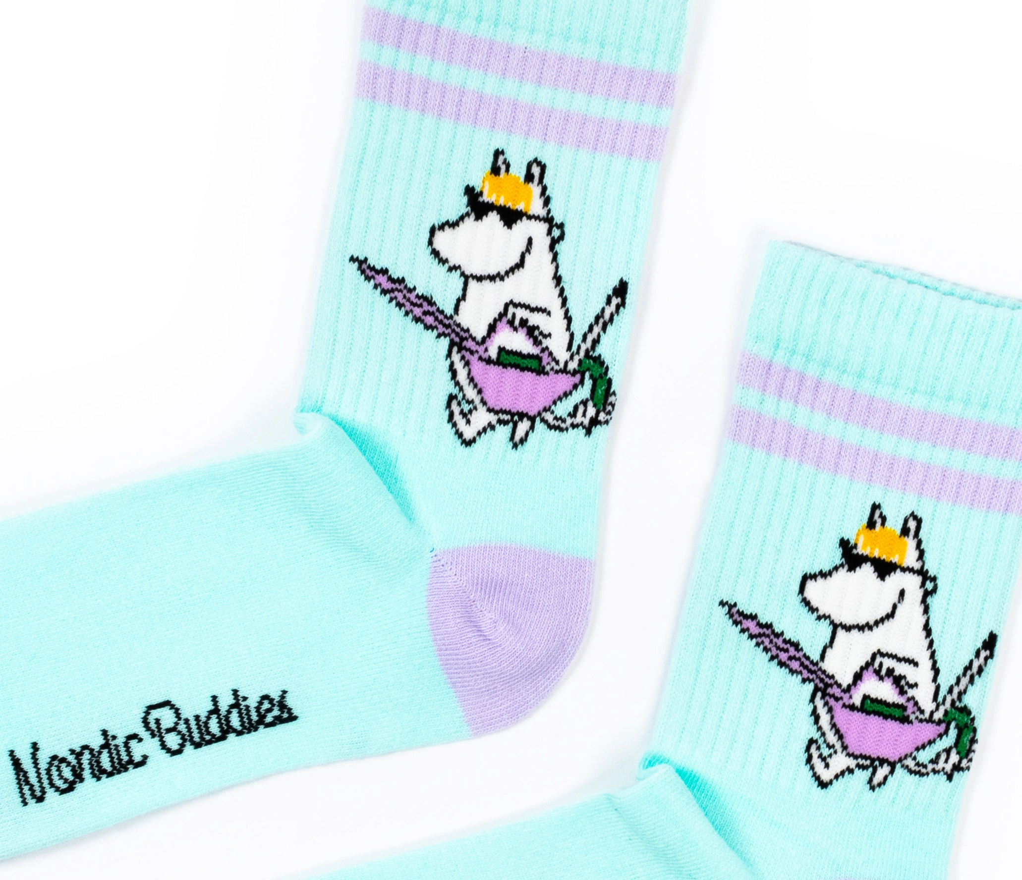 Skarpetki Muminki z Migotką w stylu retro to wyjątkowy dodatek dla fanek klasycznego designu i pastelowych kolorów. Połączenie mięty i delikatnego fioletu nadaje im subtelny, dziewczęcy charakter.
